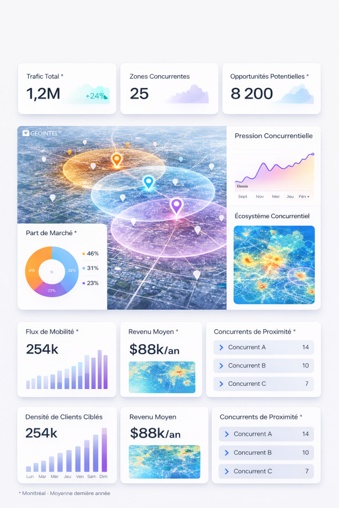 Les analyses GÉOANALYTICS™ combinent données de mobilité, socio-démographiques et comportementales afin d’éclairer les décisions d’investissement et de croissance.